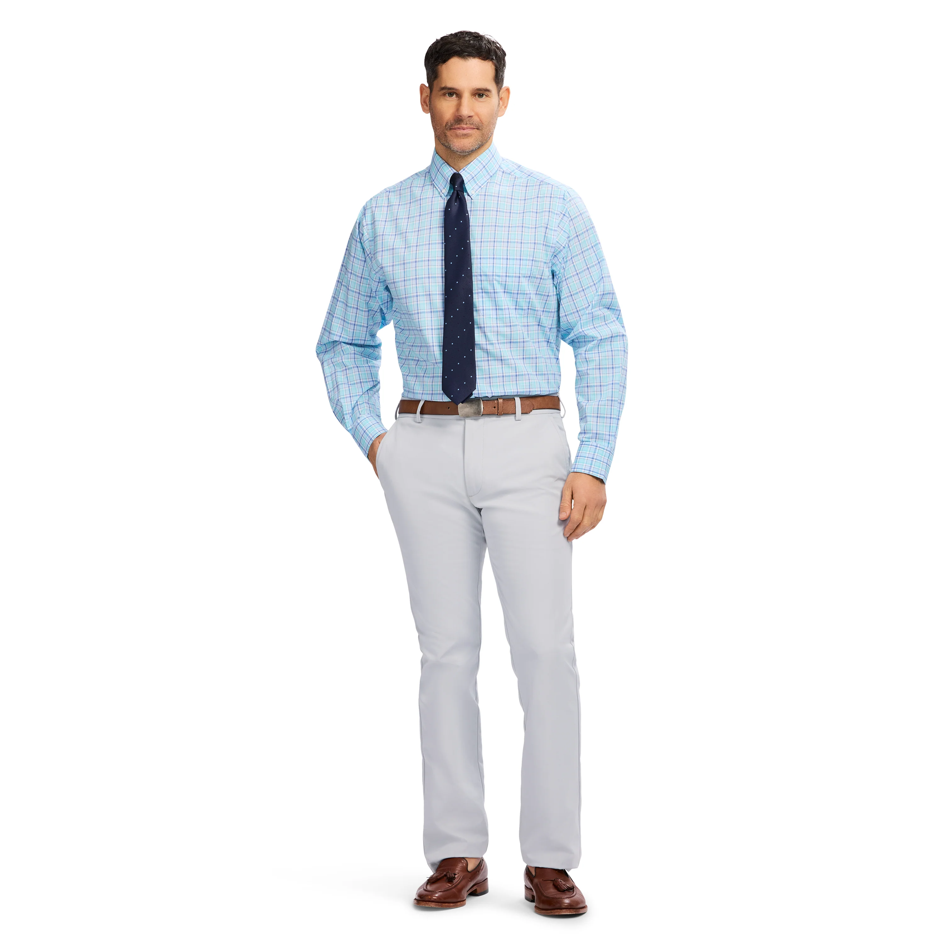 This classic fit, long sleeve, button down shirt is cut from an easy-to-wear fabric with added stretch, so it keeps its shape and moves with you throughout the day. The cotton-blend is machine washable made from recycled materials, it’s also easy on our planet. Also wrinkle resistant so you can leave your iron unplugged.